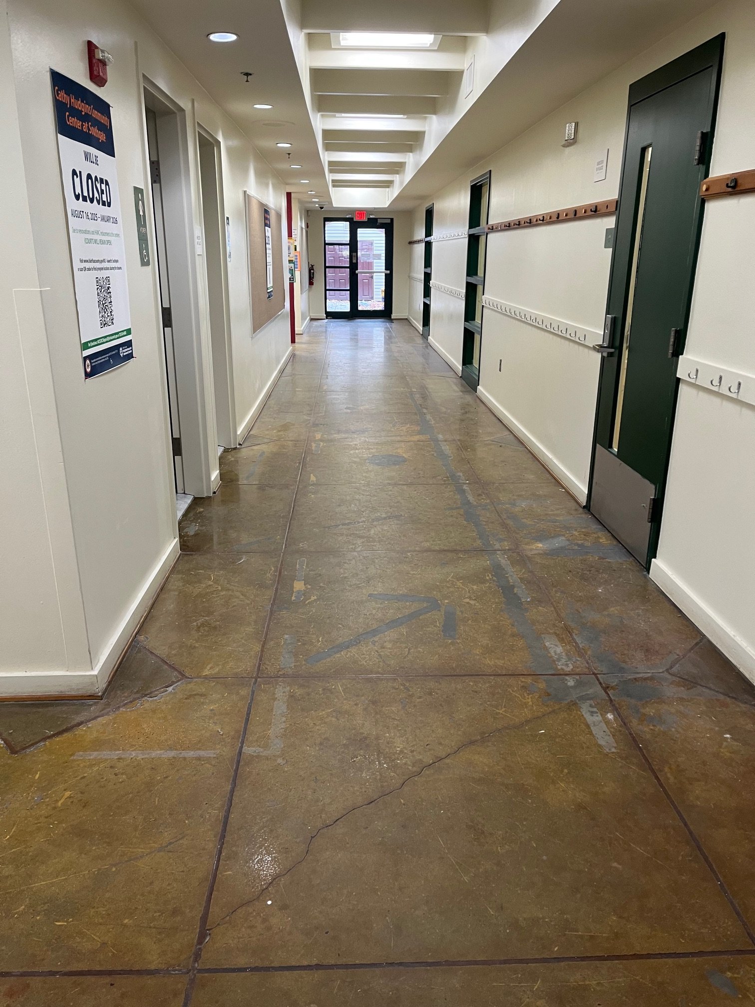 The floor was mechanically ground to remove contaminants, surface imperfections, and old residues. This step opens the concrete pores so stain and densifiers can properly penetrate.