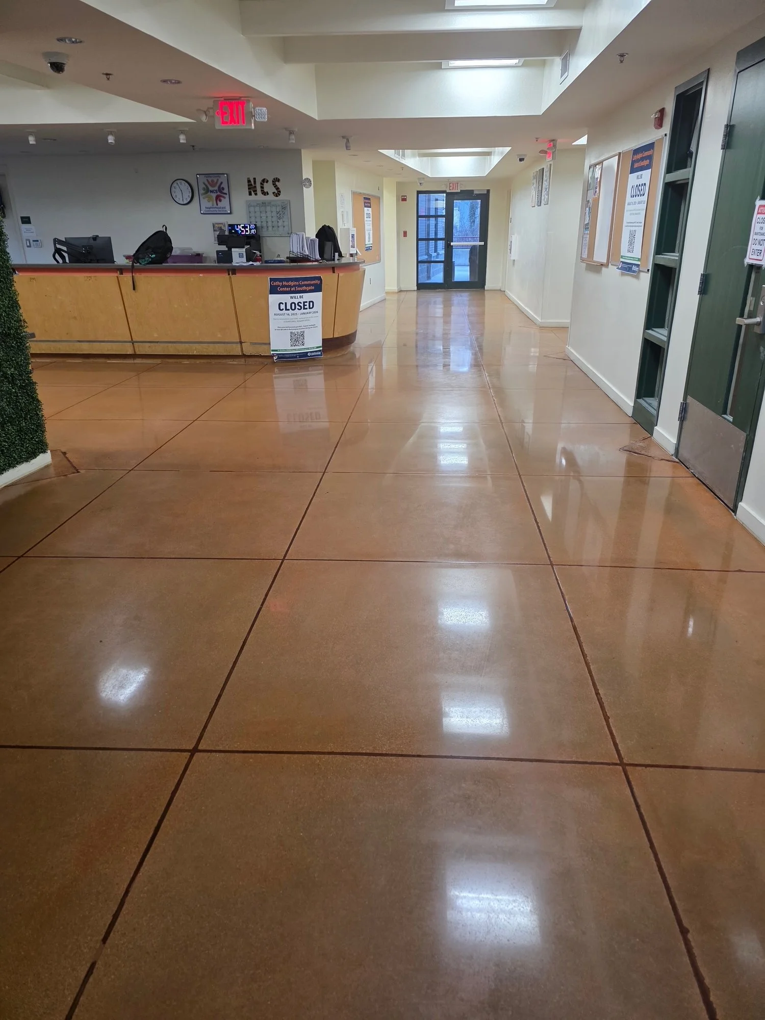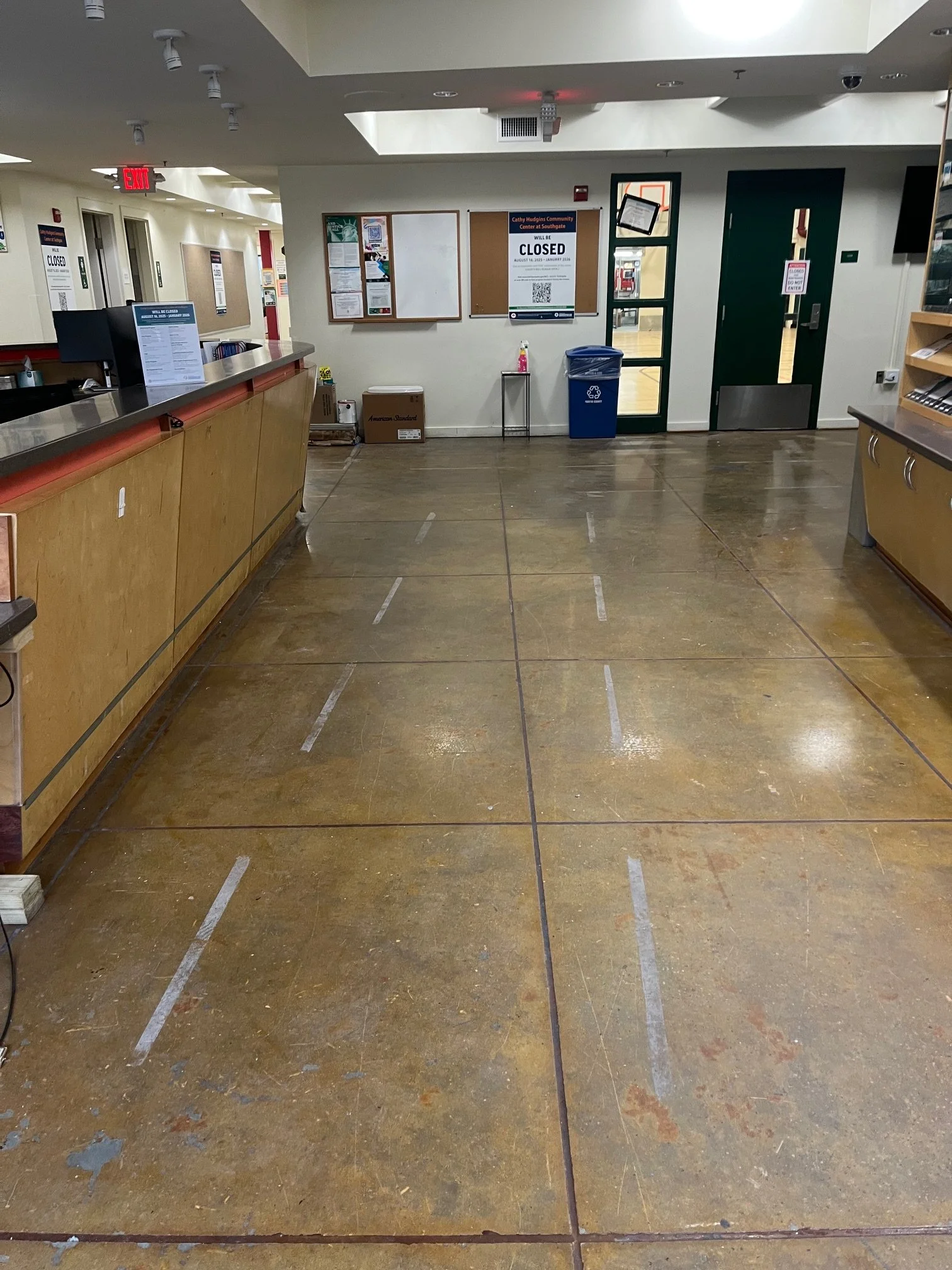 The original concrete floor showed typical signs of wear: surface dullness, uneven coloration, minor staining, and a lack of reflectivity. While structurally sound, the floor lacked visual appeal and the refined finish needed for a clean, professional environment.
