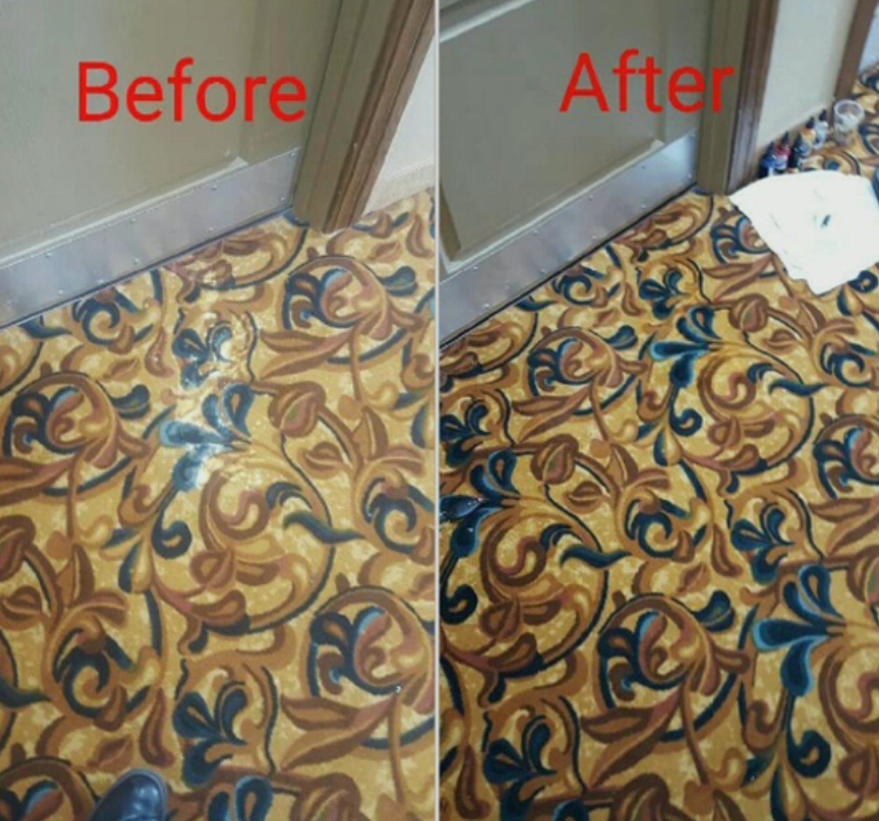 Bleach repairs are the #1 most common type of color dye repair requested. Cleaning crews often spill bleach on your carpet resulting in eye sores. That used to mean that you would have to either replace the carpet or install a patch. Our dye technicians are highly trained and skilled in achieving a perfect color match and restoring these spots to like new condition. No matter how many colors or shades are present, we can restore those eye sores saving your company thousands of dollars over the cost of replacement even on intricately patterned carpet.
